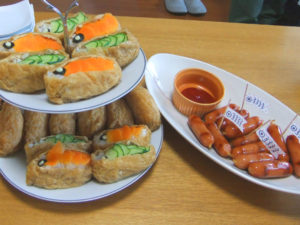 いなり寿司の上にきゅうりと人参、かまぼこで鱗を作り…