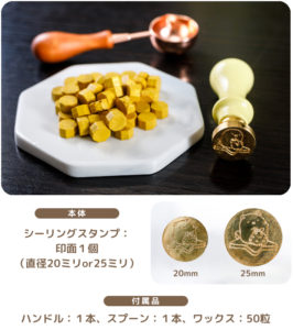 セット内容は直径20ミリか25ミリが選べるシーリングスタンプの印面、