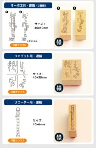 オカリナ、クラリネット、フルート、オーボエ、ファゴット、リコーダーの運指図のスタンプ。