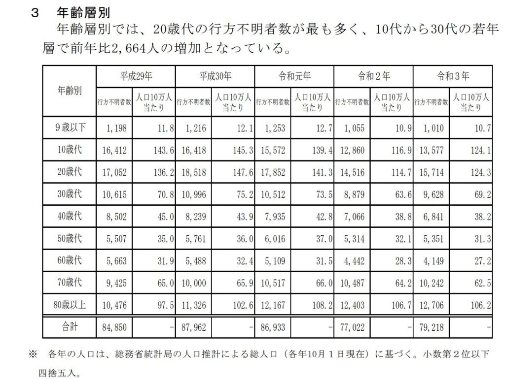 警察庁が発表している「令和3年中の行方不明者」の統計は次のとおりです。
