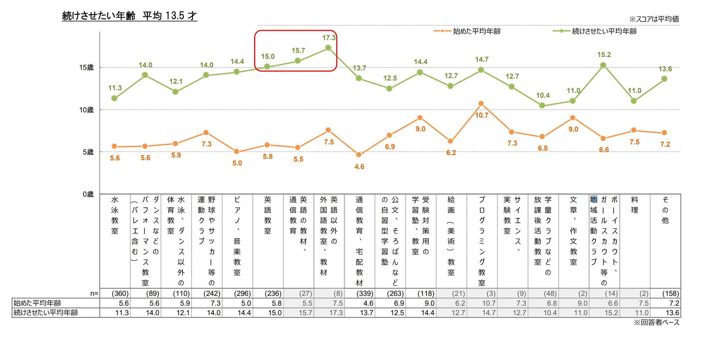 上記は習い事の開始年齢と、続けさせたい平均年齢がグラフ化されています。