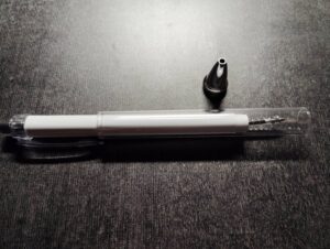 レフィルを入れたら、ペン先のカバー(銀色)を入れて回して固定させてください。