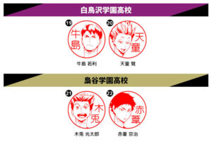 日向・影山・月島・山口など烏野高校のメンバーや、青葉城西高校の及川・岩泉、音駒高校の黒尾・孤爪・夜久・灰羽などはもちろん、伊達工業高校の青根・二口、白鳥沢学園の牛島・天童、梟谷学園高校の木兎・赤葦もラインナップ。