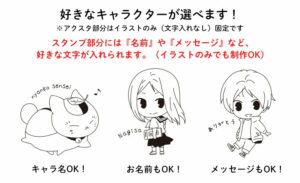 スタンプ部分のテキストは、キャラクター名はもちろん、自分の名前や好きなメッセージを入れることも。お好みにあわせて、テキストを入れずにイラストのみで作ることもできます。