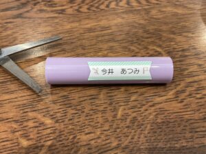 100円ショップダイソーのはさみにお名前書きをするコツ2つめは、お名前スタンプはタテ方向に押すことです。