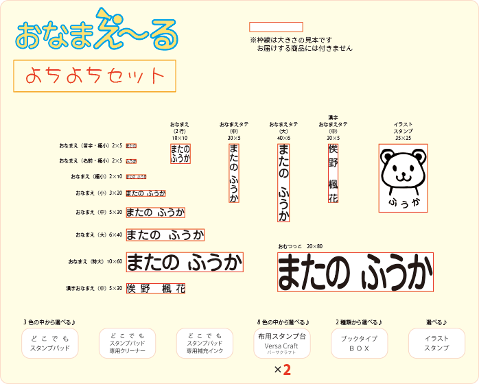 おなまえ(苗字・極小)2×5 / おなまえ(名前・極小)2×5 / おなまえ(極小)2×10 / おなまえ(小)3×20 / おなまえ(中)5×30 / おなまえ(大)6×40 / おなまえ(特大)10×60 / おなまえ(2行)10×10 / おなまえタテ(中)30×5 / おなまえタテ(大)40×6 / 漢字おなまえ(中)5×30 / 漢字おなまえタテ(中)30×52 どこでもスタンプパッド×1個